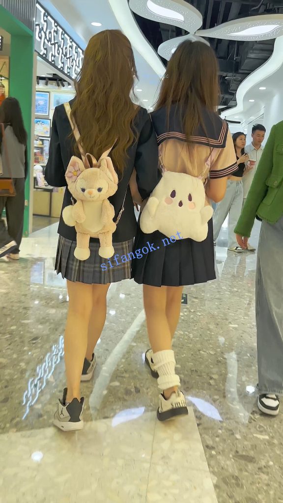 •  JK学生妹和闺蜜逛街·肉色丝袜灰色内内全夹进屁股里